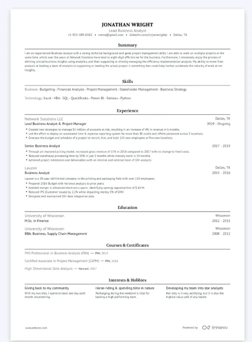El modelo es un CV simple, que tiene como objetivo facilitar el análisis automático del CV (resume parsing) que realizan los ATS (Applicant Tracking System) que utilizan las empresas para el proceso de preselección. Los CVs de «diseño» que son visualmente atractivos, son a su vez difíciles de analizar por los sistemas automáticos (al menos por ahora) y pueden hacer que tu CV sea descartado sin llegar a las manos del reclutador.